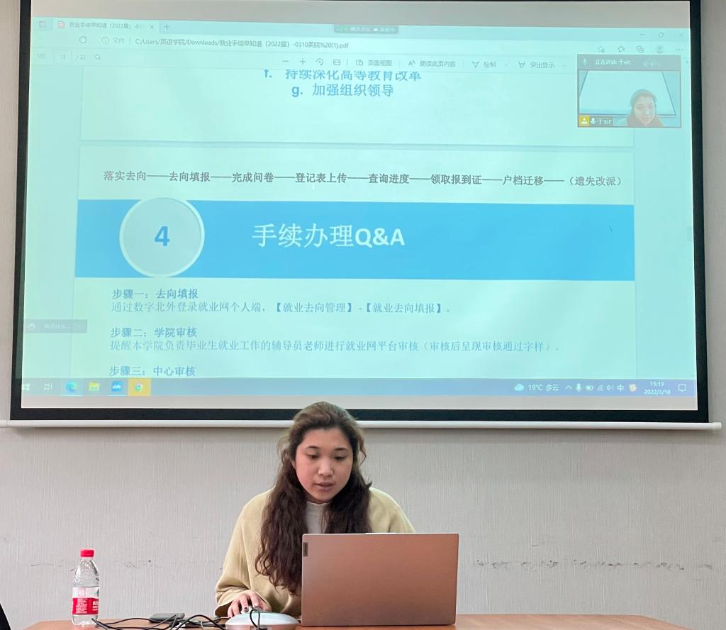 为推进2022届毕业生就业工作的进一步落实,助力毕业生顺利就业,437ccm必赢国际官方网站于3月10日召开2022届毕业生毕业手续办理答疑会。会议采取了线上为主、线下同步的方式进行。学校就业创业中心高百卉老师主讲,辅导员于承杰主持,437ccm必赢国际官方网站2022届本科毕业生及研究生毕业生参加。